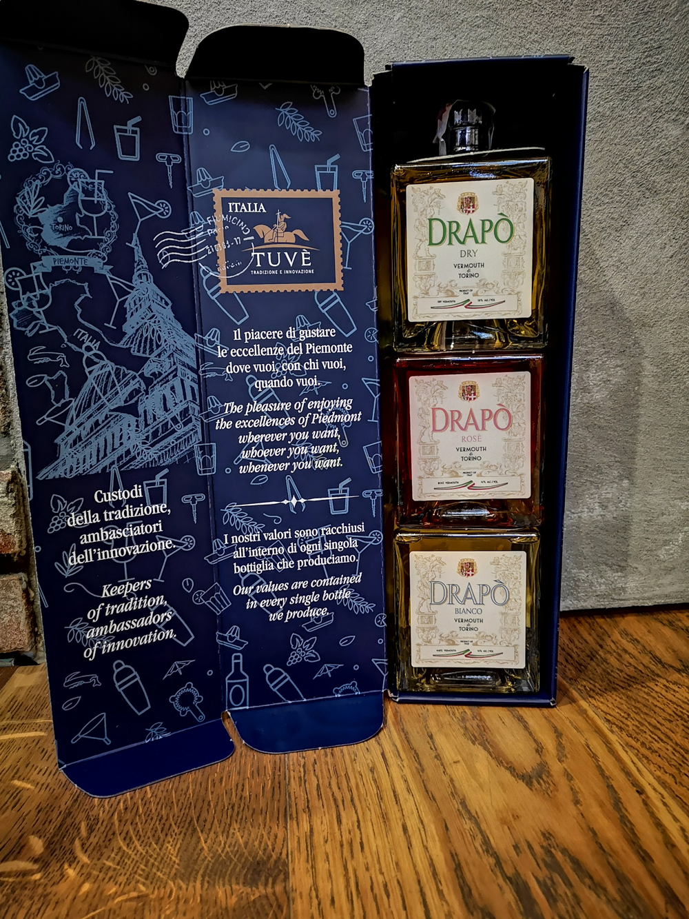 The Vermouth kit from Tuve is made in Turin and consists of 3 vermouths – Dry, White, and Rose.
